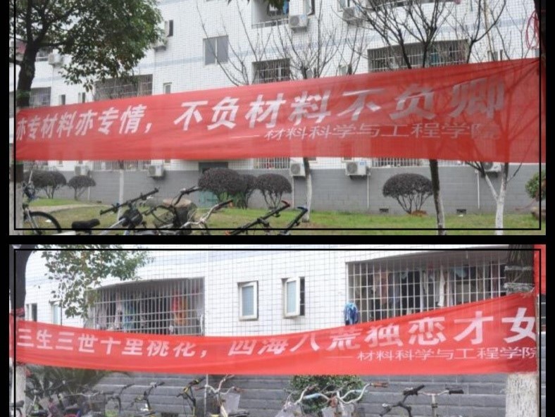 3月6日晚,材料院男生们早早开始精心准备。院员工会为全院女生挂出横幅“亦专材料亦专情,不负材料不负卿”,“三生三世十里桃花,四海八荒独恋才女”,抒发对女生由衷的赞美与关心。各班才子也寄深情于文字,凝祝福于横幅,陆陆续续挂出“世间佳丽有万千,偏争你心共婵娟”“女王大人们节日快乐”等横幅。